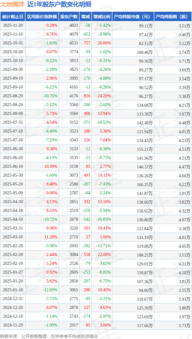 从股价来看,2025年11月10日至2025年11月20日,大地海洋区间涨幅为0.28%,在此期间股东户数减少58.0户,减幅为1.42%。