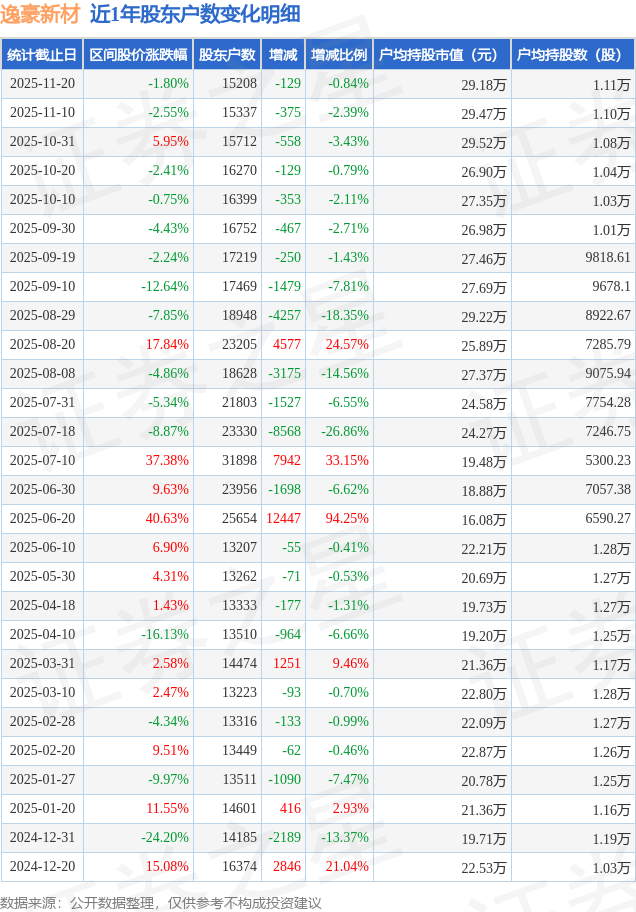从股价来看,2025年11月10日至2025年11月20日,逸豪新材区间跌幅为1.8%,在此期间股东户数减少129.0户,减幅为0.84%。