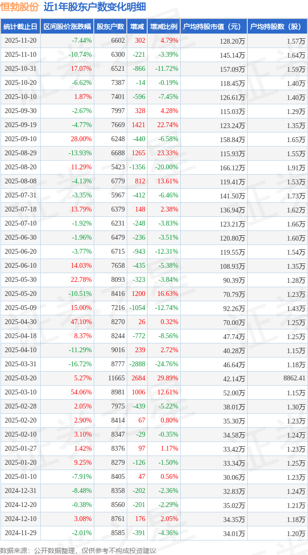 从股价来看,2025年11月10日至2025年11月20日,恒勃股份区间跌幅为7.44%,在此期间股东户数增加302.0户,增幅为4.79%。