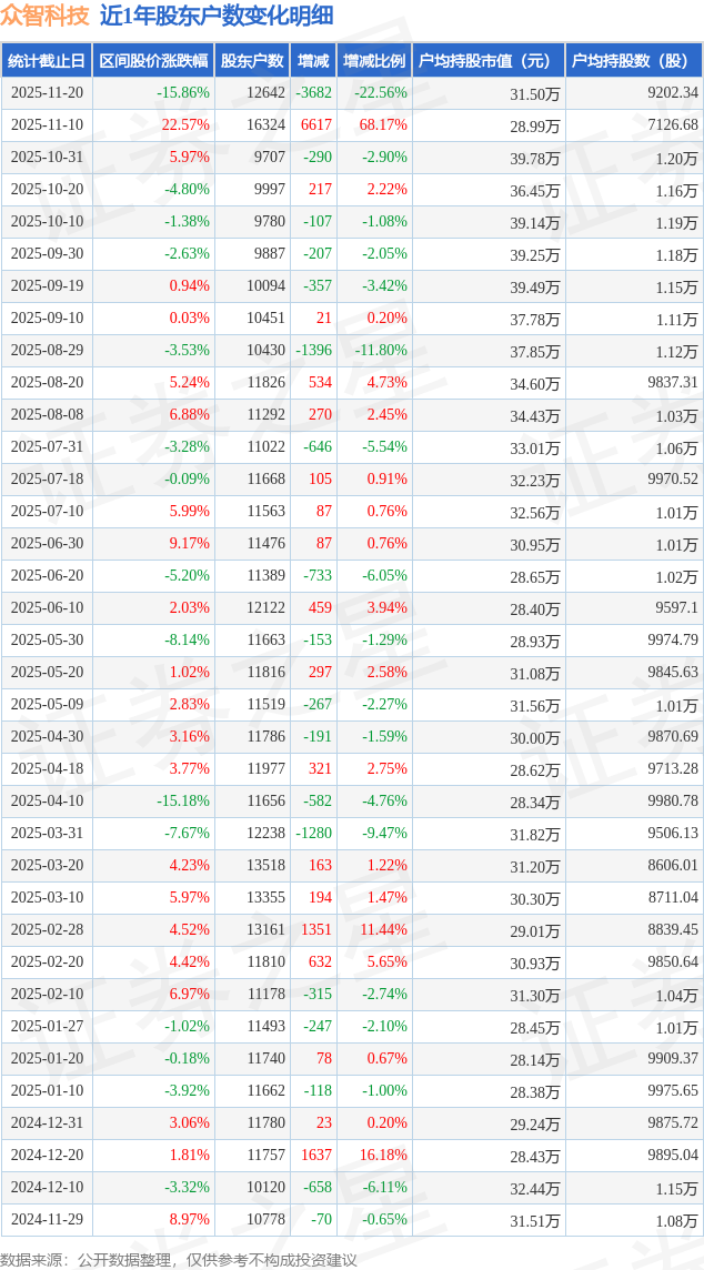 从股价来看,2025年11月10日至2025年11月20日,众智科技区间跌幅为15.86%,在此期间股东户数减少3682.0户,减幅为22.56%。