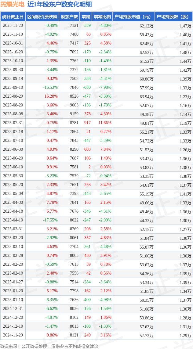 从股价来看,2025年11月10日至2025年11月20日,民爆光电区间跌幅为0.49%,在此期间股东户数减少359.0户,减幅为4.8%。