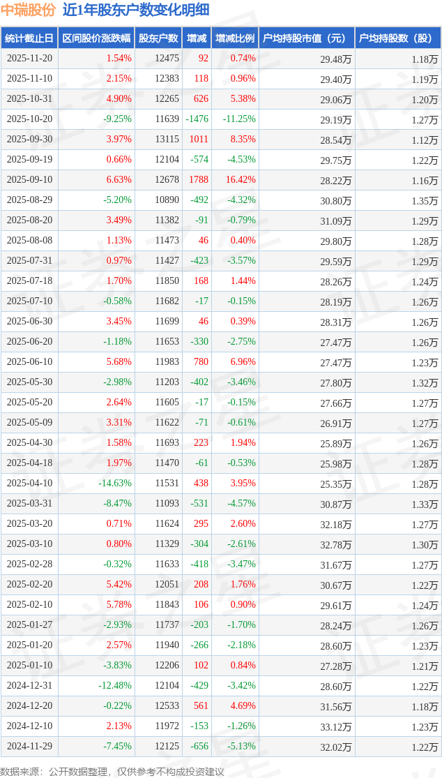 从股价来看,2025年11月10日至2025年11月20日,中瑞股份区间涨幅为1.54%,在此期间股东户数增加92.0户,增幅为0.74%。