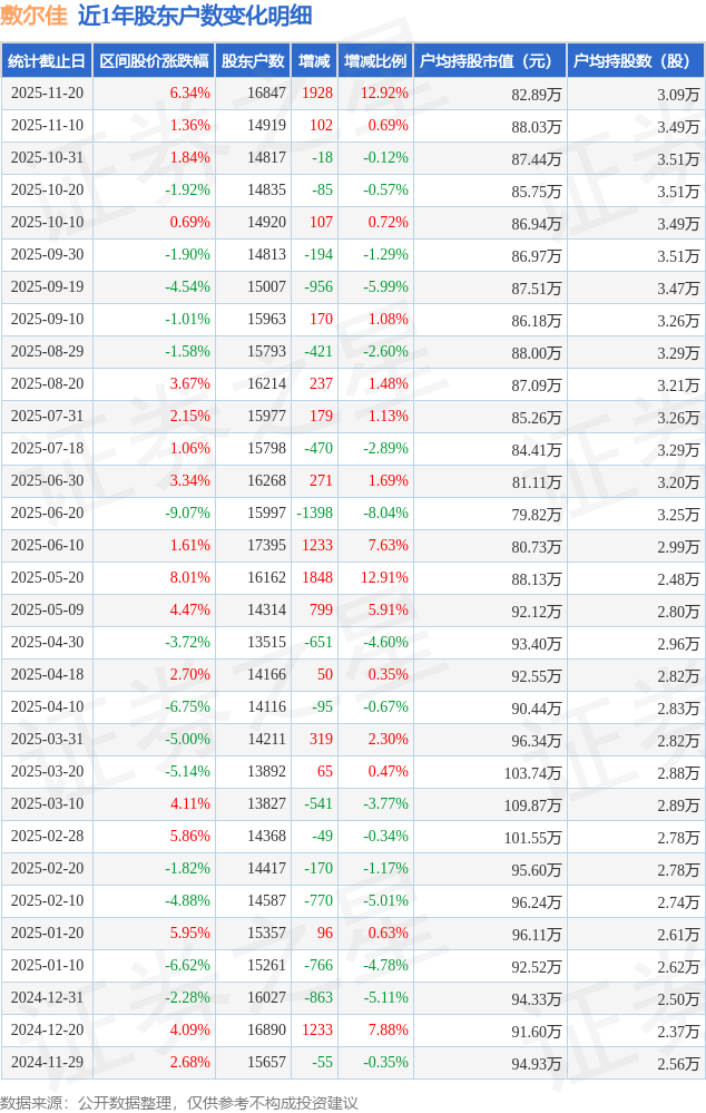 从股价来看,2025年11月10日至2025年11月20日,敷尔佳区间涨幅为6.34%,在此期间股东户数增加1928.0户,增幅为12.92%。