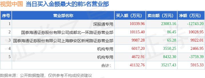证券之星消息,沪深交易所2025年11月21日公布的交易公开信息显示,视觉中国(000681)因日涨幅偏离值达到7%的前5只证券登上龙虎榜。此次是近5个交易日内第2次上榜。