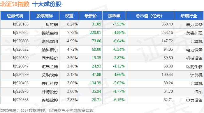 资金流向方面,北证50(899050)指数成份股当日主力资金净流出合计3.26亿元,游资资金净流出合计3.09亿元,散户资金净流出合计3783.91万元。成份股资金流向详情见下表: