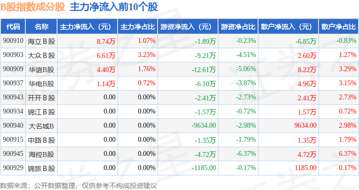 资金流向方面,B股指数(000003)成份股当日主力资金净流出合计220.46万元,游资资金净流出合计311.42万元,散户资金净流入合计531.89万元。成份股资金流向详情见下表: