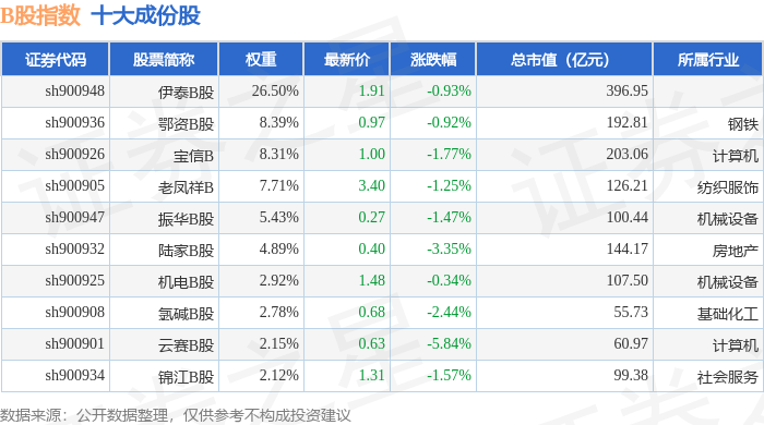 B股指数(000003)十大成份股详情如下: