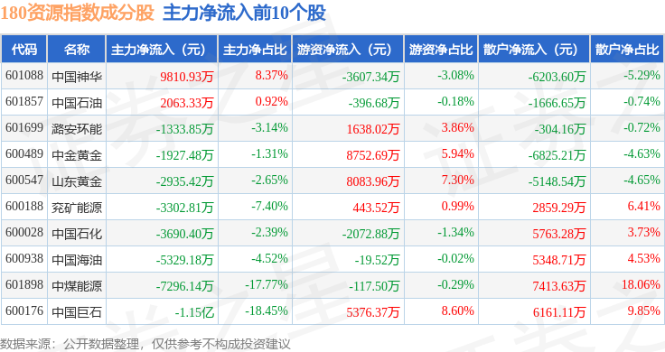 资金流向方面,180资源(000026)指数成份股当日主力资金净流出合计38.94亿元,游资资金净流入合计9.8亿元,散户资金净流入合计29.14亿元。成份股资金流向详情见下表: