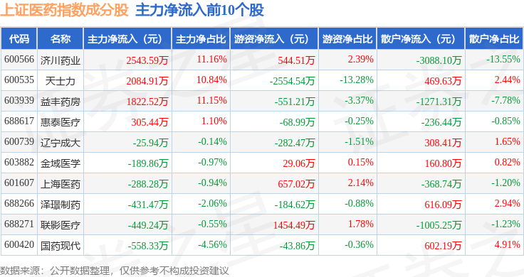 资金流向方面,上证医药(000037)指数成份股当日主力资金净流出合计18.07亿元,游资资金净流入合计2.06亿元,散户资金净流入合计16.01亿元。成份股资金流向详情见下表: