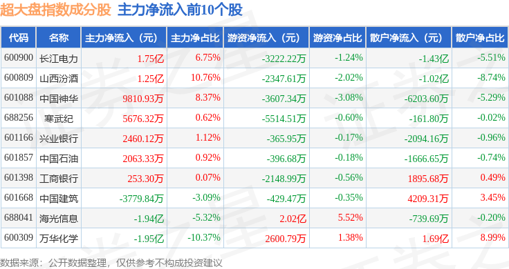 资金流向方面,超大盘(000043)指数成份股当日主力资金净流出合计40.22亿元,游资资金净流入合计17.62亿元,散户资金净流入合计22.6亿元。成份股资金流向详情见下表: