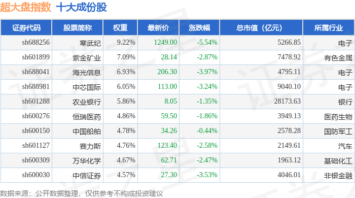 超大盘(000043)指数十大成份股详情如下: