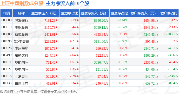 资金流向方面,上证中盘(000044)指数成份股当日主力资金净流出合计142.01亿元,游资资金净流入合计38.49亿元,散户资金净流入合计103.52亿元。成份股资金流向详情见下表: