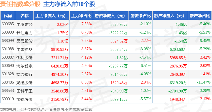 资金流向方面,责任指数(000048)成份股当日主力资金净流出合计38.91亿元,游资资金净流入合计6.58亿元,散户资金净流入合计32.33亿元。成份股资金流向详情见下表:
