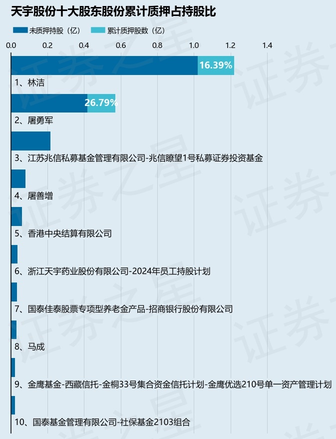 截止本公告日,股东林洁已累计质押股份2000.0万股,占其持股总数的16.39%,股东屠勇军已累计质押股份1530.0万股,占其持股总数的26.79%。本次质押后天宇股份十大股东的累计质押股份占持股比例(占持股比例的计算以公司最新一期财务报表公布的十大股东的持股总数为基准)见下图: