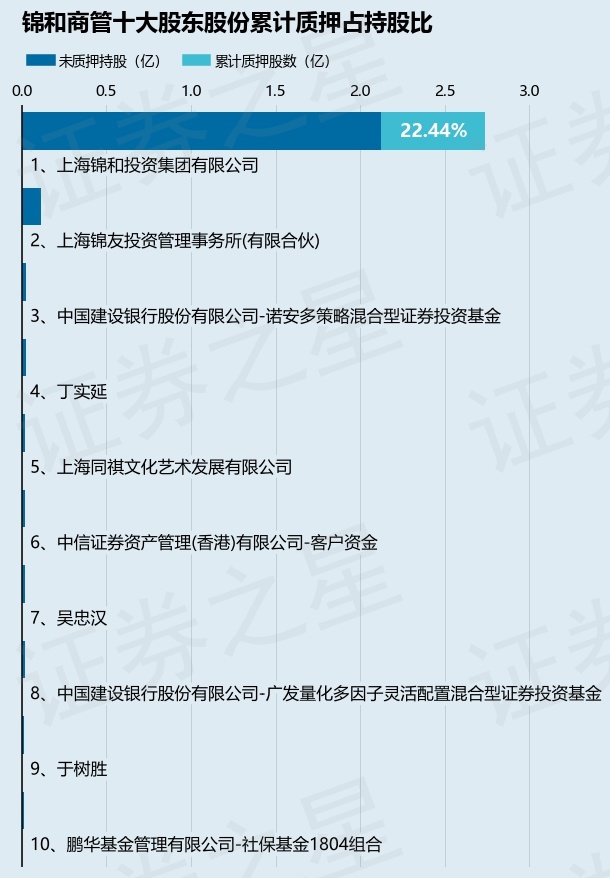 截止本公告日,股东上海锦和投资集团有限公司已累计质押股份6150.0万股,占其持股总数的22.44%。本次质押后锦和商管十大股东的累计质押股份占持股比例(占持股比例的计算以公司最新一期财务报表公布的十大股东的持股总数为基准)见下图: