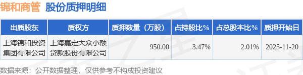 证券之星消息,锦和商管(603682)11月21日公开信息显示,股东上海锦和投资集团有限公司向上海嘉定大众小额贷款股份有限公司合计质押950.0万股,占总股本2.01%。质押详情见下表: