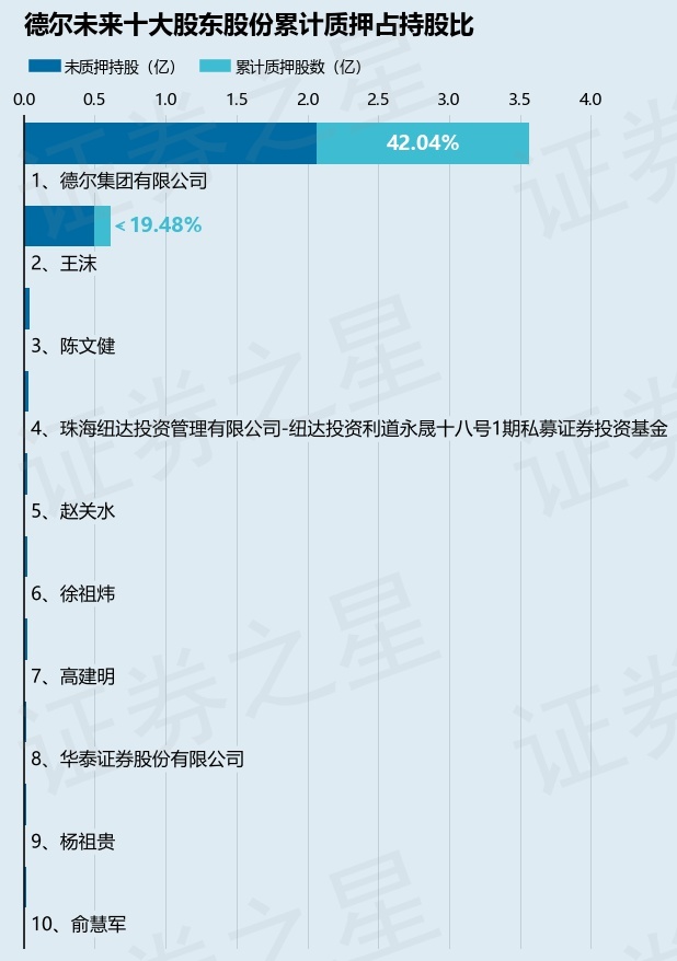 截止本公告日,股东德尔集团有限公司已累计质押股份1.5亿股,占其持股总数的42.04%,股东王沫已累计质押股份1200.0万股,占其持股总数的19.48%。本次质押后德尔未来十大股东的累计质押股份占持股比例(占持股比例的计算以公司最新一期财务报表公布的十大股东的持股总数为基准)见下图: