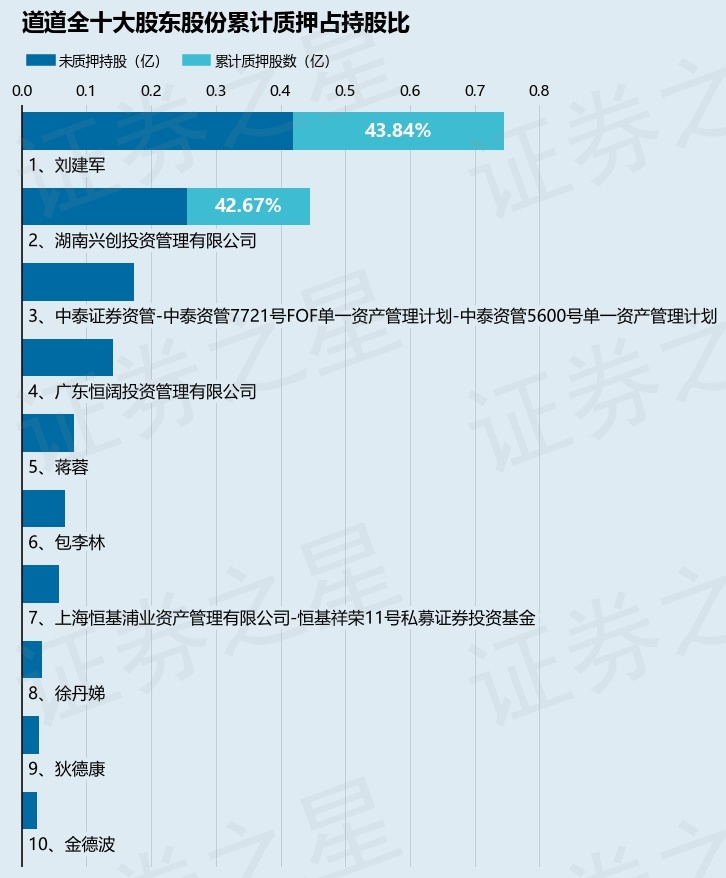 截止本公告日,股东刘建军已累计质押股份3270.0万股,占其持股总数的43.84%,股东湖南兴创投资管理有限公司已累计质押股份1900.0万股,占其持股总数的42.67%。本次质押后道道全十大股东的累计质押股份占持股比例(占持股比例的计算以公司最新一期财务报表公布的十大股东的持股总数为基准)见下图: