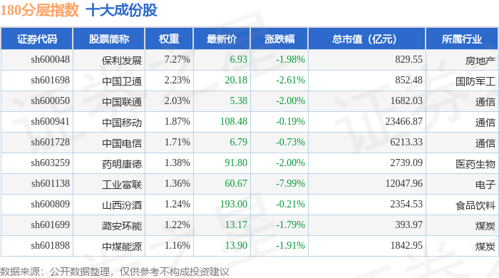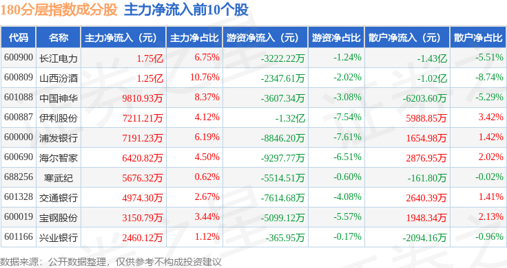 资金流向方面,180分层(000093)指数成份股当日主力资金净流出合计226.16亿元,游资资金净流入合计64.78亿元,散户资金净流入合计161.38亿元。成份股资金流向详情见下表: