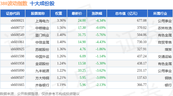 380波动(000130)指数十大成份股详情如下: