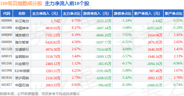 资金流向方面,180低贝(000136)指数成份股当日主力资金净流出合计21.96亿元,游资资金净流入合计4.13亿元,散户资金净流入合计17.83亿元。成份股资金流向详情见下表: