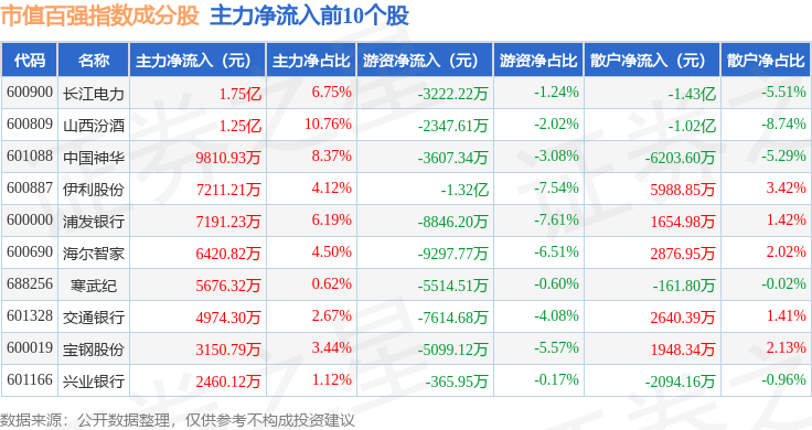 资金流向方面,市值百强(000155)指数成份股当日主力资金净流出合计186.21亿元,游资资金净流入合计51.23亿元,散户资金净流入合计134.98亿元。成份股资金流向详情见下表: