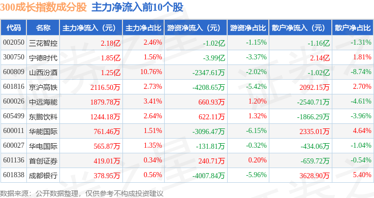 资金流向方面,300成长(000918)指数成份股当日主力资金净流出合计152.87亿元,游资资金净流入合计53.66亿元,散户资金净流入合计99.21亿元。成份股资金流向详情见下表: