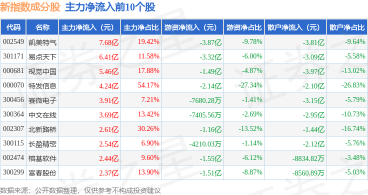 资金流向方面,新指数(399100)成份股当日主力资金净流出合计812.04亿元,游资资金净流入合计127.64亿元,散户资金净流入合计684.39亿元。成份股资金流向详情见下表: