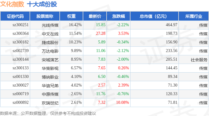 资金流向方面,文化指数(399248)成份股当日主力资金净流入合计2.71亿元,游资资金净流出合计2220.62万元,散户资金净流出合计2.49亿元。成份股资金流向详情见下表: