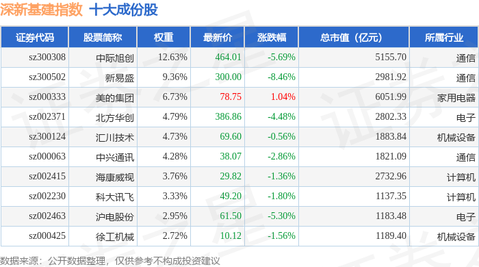 证券之星消息,11月21日,深新基建(399274)指数报收于5279.81点,跌3.8%,成交979.13亿元,换手率1.78%。当日该指数成份股中,上涨的有3家,美的集团以1.04%的涨幅领涨,下跌的有47家,北京君正以9.0%的跌幅领跌。