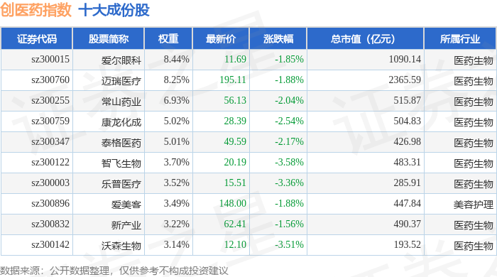 证券之星消息,11月21日,创医药(399275)指数报收于2645.0点,跌2.81%,成交159.13亿元,换手率1.89%。当日该指数成份股中,上涨的有1家,瑞迈特以3.43%的涨幅领涨,下跌的有49家,普瑞眼科以6.15%的跌幅领跌。