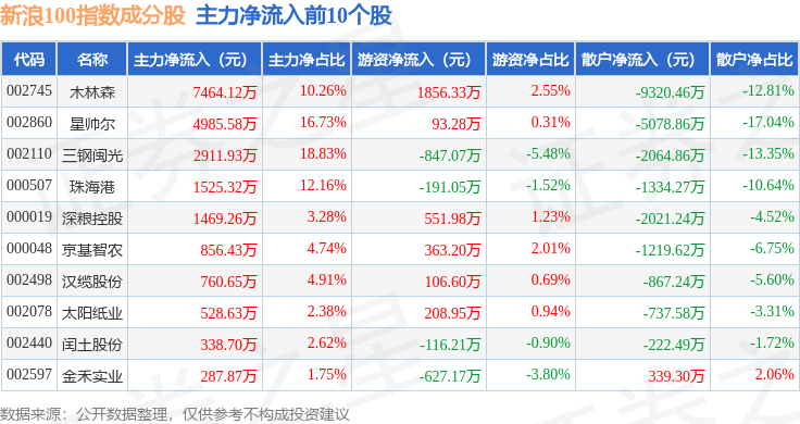 资金流向方面,新浪100(399297)指数成份股当日主力资金净流出合计12.43亿元,游资资金净流入合计3.15亿元,散户资金净流入合计9.28亿元。成份股资金流向详情见下表: