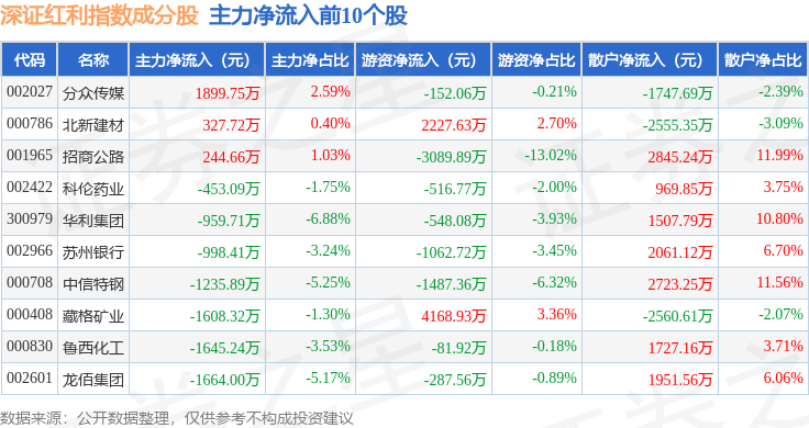 资金流向方面,深证红利(399324)指数成份股当日主力资金净流出合计25.24亿元,游资资金净流入合计9.01亿元,散户资金净流入合计16.23亿元。成份股资金流向详情见下表: