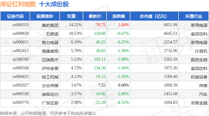 证券之星消息,11月21日,深证红利(399324)指数报收于8972.47点,跌1.28%,成交326.11亿元,换手率1.03%。当日该指数成份股中,上涨的有3家,美的集团以1.04%的涨幅领涨,下跌的有35家,藏格矿业以5.92%的跌幅领跌。
