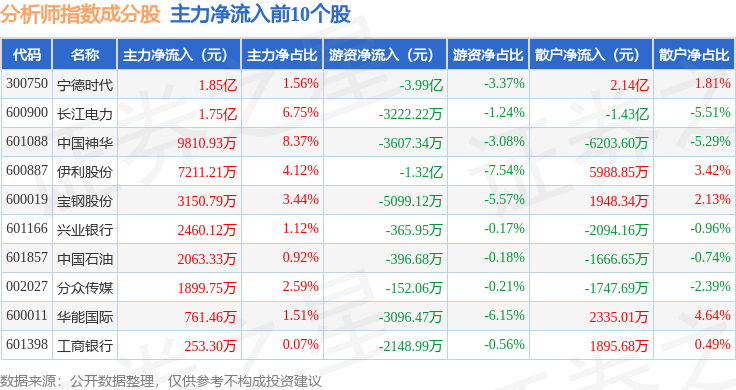 资金流向方面,分析师指数(399354)成份股当日主力资金净流出合计134.31亿元,游资资金净流入合计31.59亿元,散户资金净流入合计102.72亿元。成份股资金流向详情见下表: