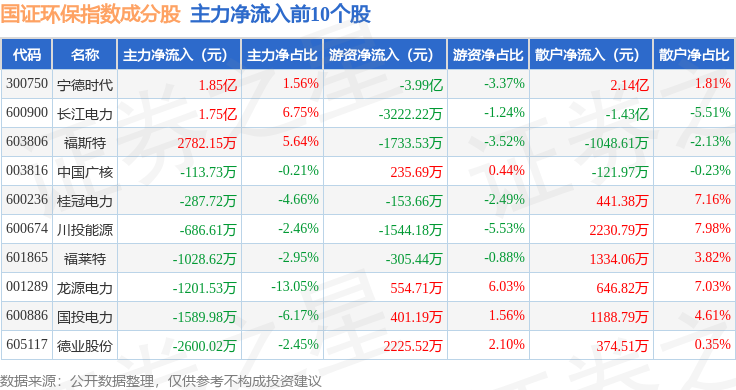 资金流向方面,国证环保(399358)指数成份股当日主力资金净流出合计92.13亿元,游资资金净流入合计14.66亿元,散户资金净流入合计77.47亿元。成份股资金流向详情见下表: