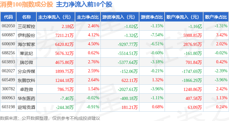 资金流向方面,消费100(399364)指数成份股当日主力资金净流出合计206.59亿元,游资资金净流入合计62.06亿元,散户资金净流入合计144.52亿元。成份股资金流向详情见下表: