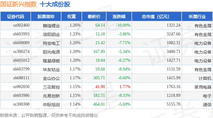 证券之星消息,11月21日,国证新兴(399392)指数报收于2846.57点,跌2.79%,成交2696.15亿元,换手率1.09%。当日该指数成份股中,上涨的有6家,传音控股以6.26%的涨幅领涨,下跌的有92家,赣锋锂业以10.0%的跌幅领跌。