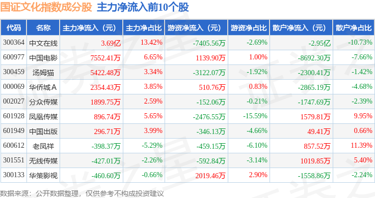 资金流向方面,国证文化(399397)指数成份股当日主力资金净流出合计35.73亿元,游资资金净流入合计8.74亿元,散户资金净流入合计26.99亿元。成份股资金流向详情见下表: