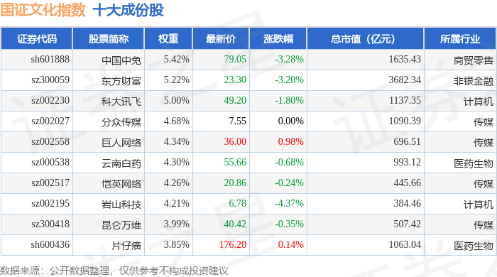 证券之星消息,11月21日,国证文化(399397)指数报收于2214.83点,跌1.32%,成交497.66亿元,换手率3.3%。当日该指数成份股中,上涨的有6家,中文在线以3.53%的涨幅领涨,下跌的有42家,通化金马以4.84%的跌幅领跌。