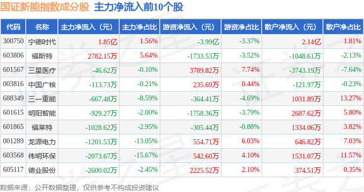 资金流向方面,国证新能(399412)指数成份股当日主力资金净流出合计115.53亿元,游资资金净流入合计18.65亿元,散户资金净流入合计96.88亿元。成份股资金流向详情见下表: