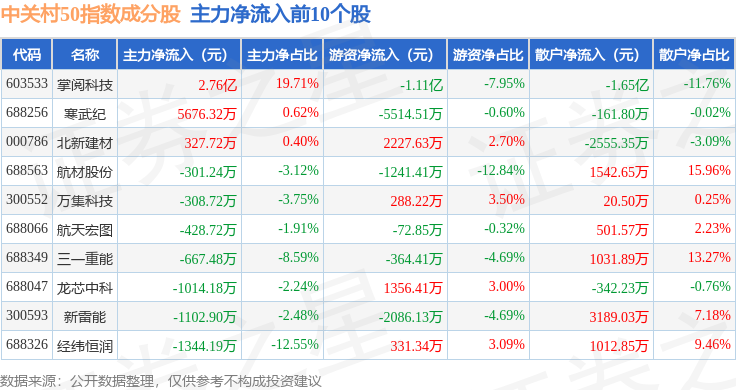 资金流向方面,中关村50(399423)指数成份股当日主力资金净流出合计38.63亿元,游资资金净流入合计8.43亿元,散户资金净流入合计30.21亿元。成份股资金流向详情见下表: