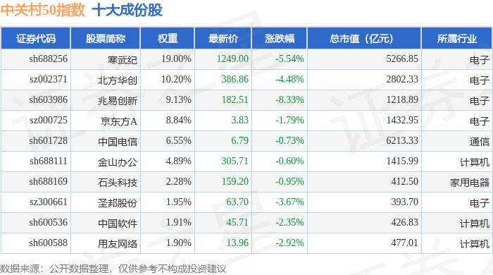证券之星消息,11月21日,中关村50(399423)指数报收于2777.5点,跌3.73%,成交467.86亿元,换手率1.16%。当日该指数成份股中,上涨的有3家,掌阅科技以6.22%的涨幅领涨,下跌的有46家,北京君正以9.0%的跌幅领跌。