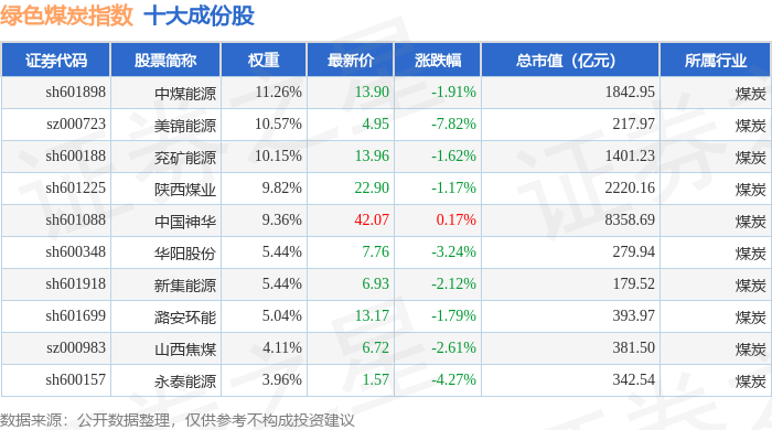 绿色煤炭(399436)指数十大成份股详情如下: