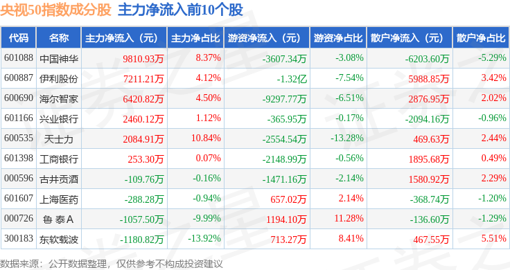 资金流向方面,央视50(399550)指数成份股当日主力资金净流出合计44.07亿元,游资资金净流入合计11.03亿元,散户资金净流入合计33.04亿元。成份股资金流向详情见下表: