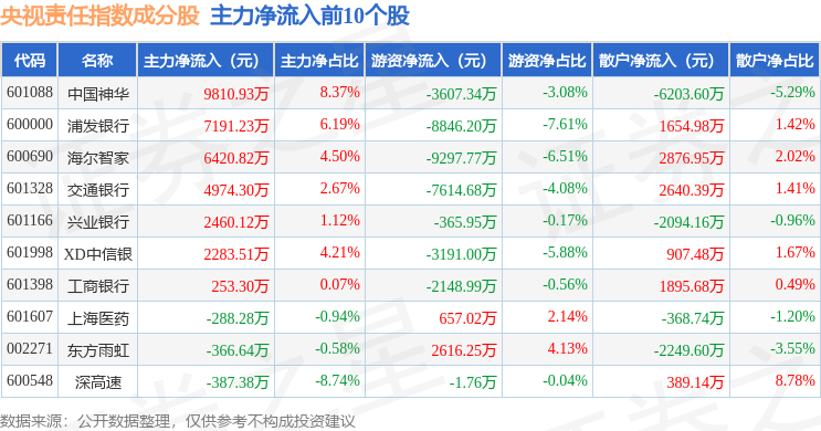 资金流向方面,央视责任(399555)指数成份股当日主力资金净流出合计36.73亿元,游资资金净流入合计3.7亿元,散户资金净流入合计33.03亿元。成份股资金流向详情见下表: