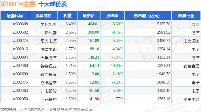 证券之星消息,11月21日,深100EW(399632)指数报收于4914.62点,跌3.11%,成交1983.85亿元,换手率1.14%。当日该指数成份股中,上涨的有6家,古井贡酒以1.88%的涨幅领涨,下跌的有91家,赣锋锂业以10.0%的跌幅领跌。