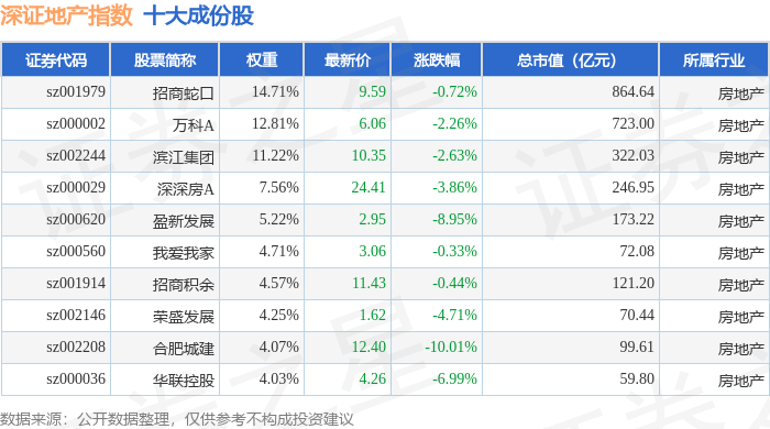 深证地产(399637)指数十大成份股详情如下: