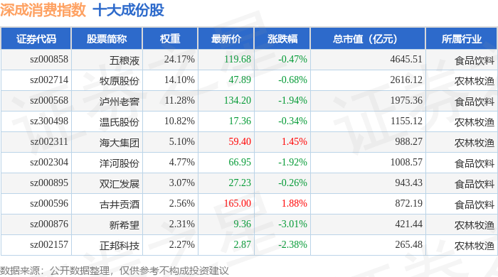 证券之星消息,11月21日,深成消费(399684)指数报收于1892.8点,跌0.97%,成交134.99亿元,换手率1.24%。当日该指数成份股中,上涨的有3家,古井贡酒以1.88%的涨幅领涨,下跌的有24家,酒鬼酒以4.8%的跌幅领跌。