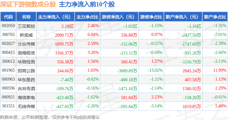资金流向方面,深证下游(399706)指数成份股当日主力资金净流出合计64.06亿元,游资资金净流入合计10.62亿元,散户资金净流入合计53.44亿元。成份股资金流向详情见下表:
